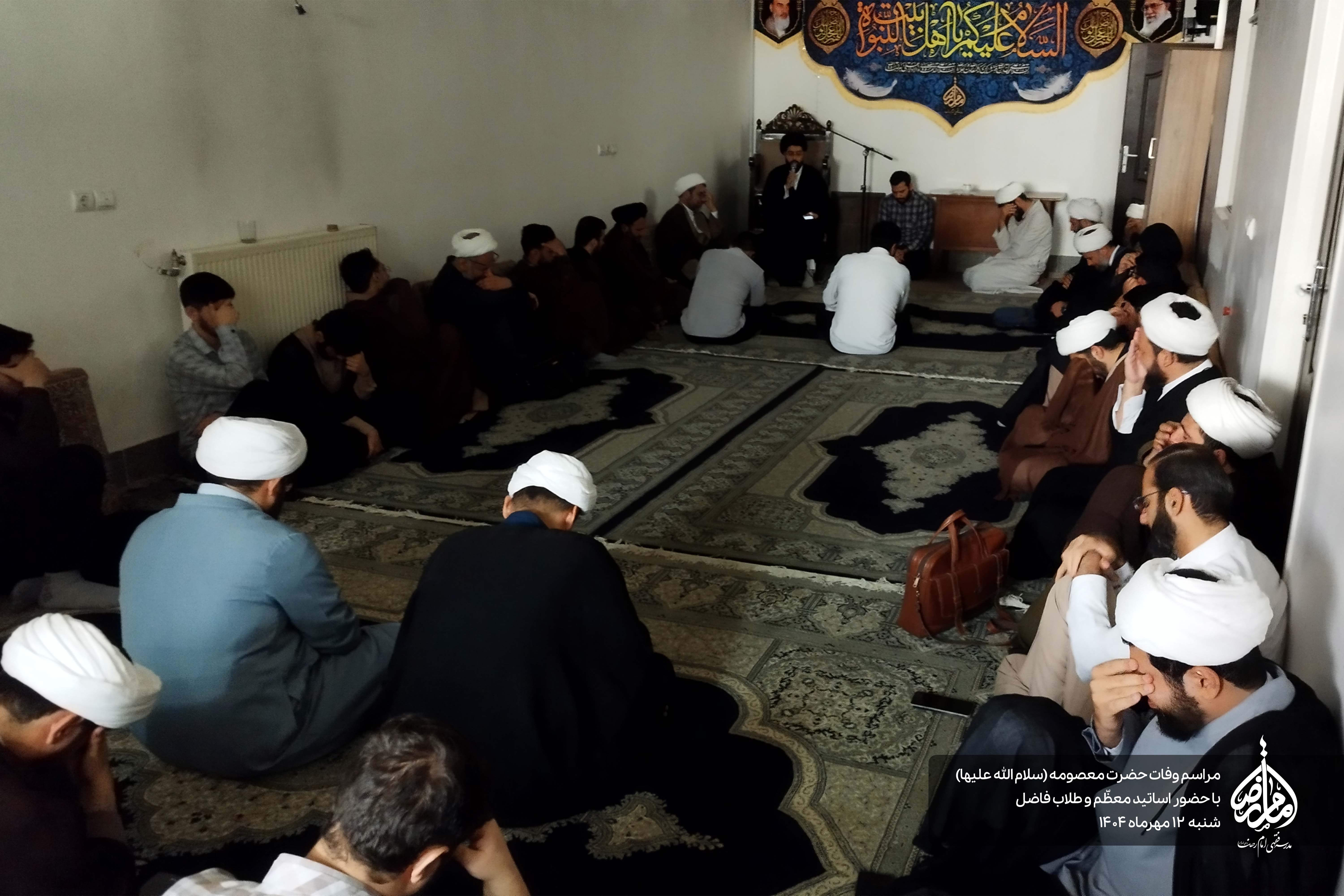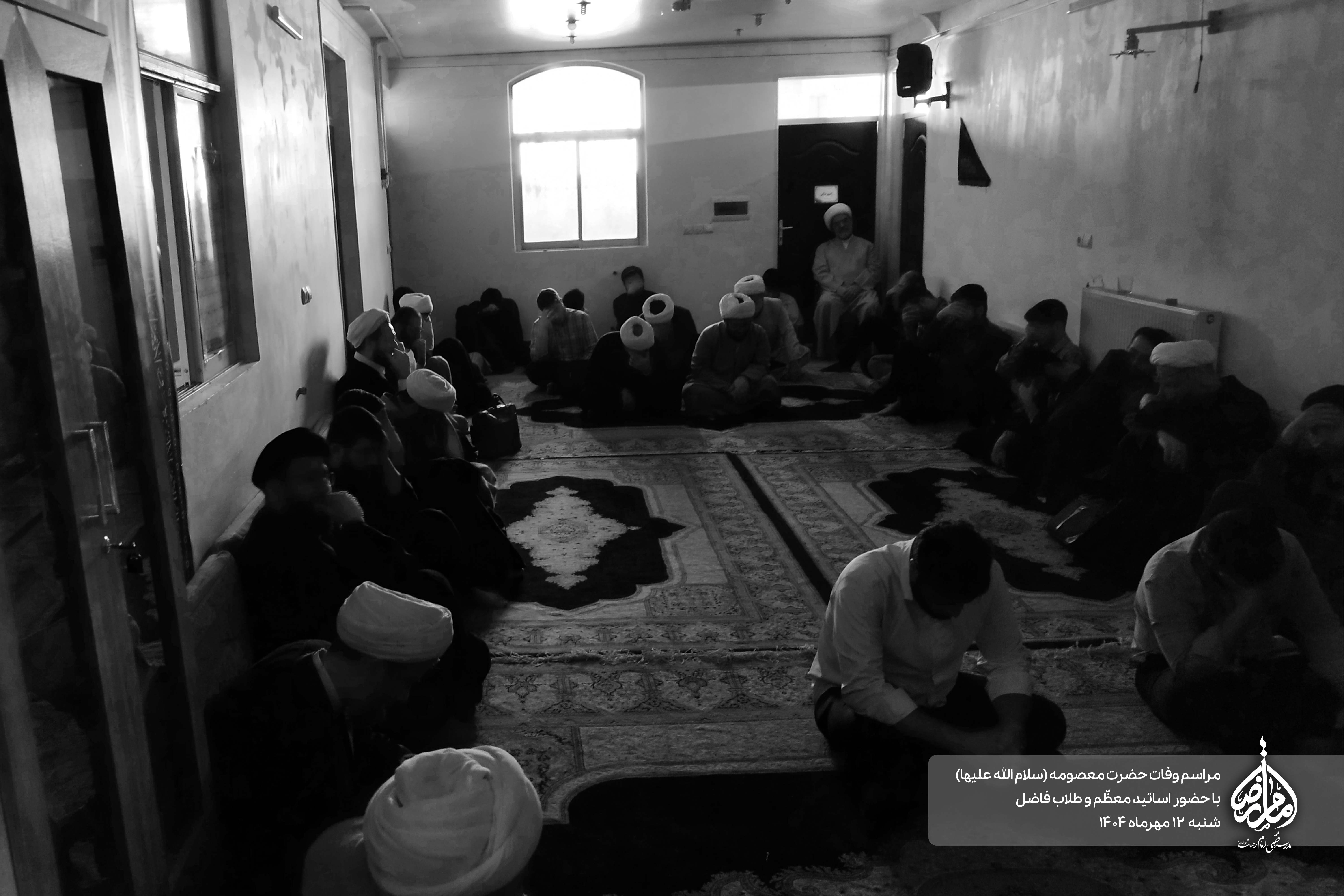 همزمان با سالروز وفات شهادتگونه حضرت فاطمه معصومه (سلاماللهعلیها)، مراسم عزاداری و سوگواری با حضور اساتید، طلاب و کارکنان مدرسه در روز شنبه ۱۲ مهرماه ۱۴۰۴ برگزار شد.